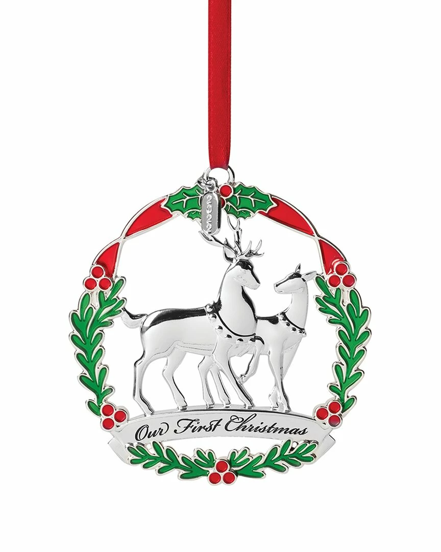 - Design details: this ornament is surrounded by holly and happiness. Spend your first Christmas together cuddling and cozy like it’s true love. Crafted in the shape of a pair of delightfully festive deer to remind you that these two halves come together to make a whole.