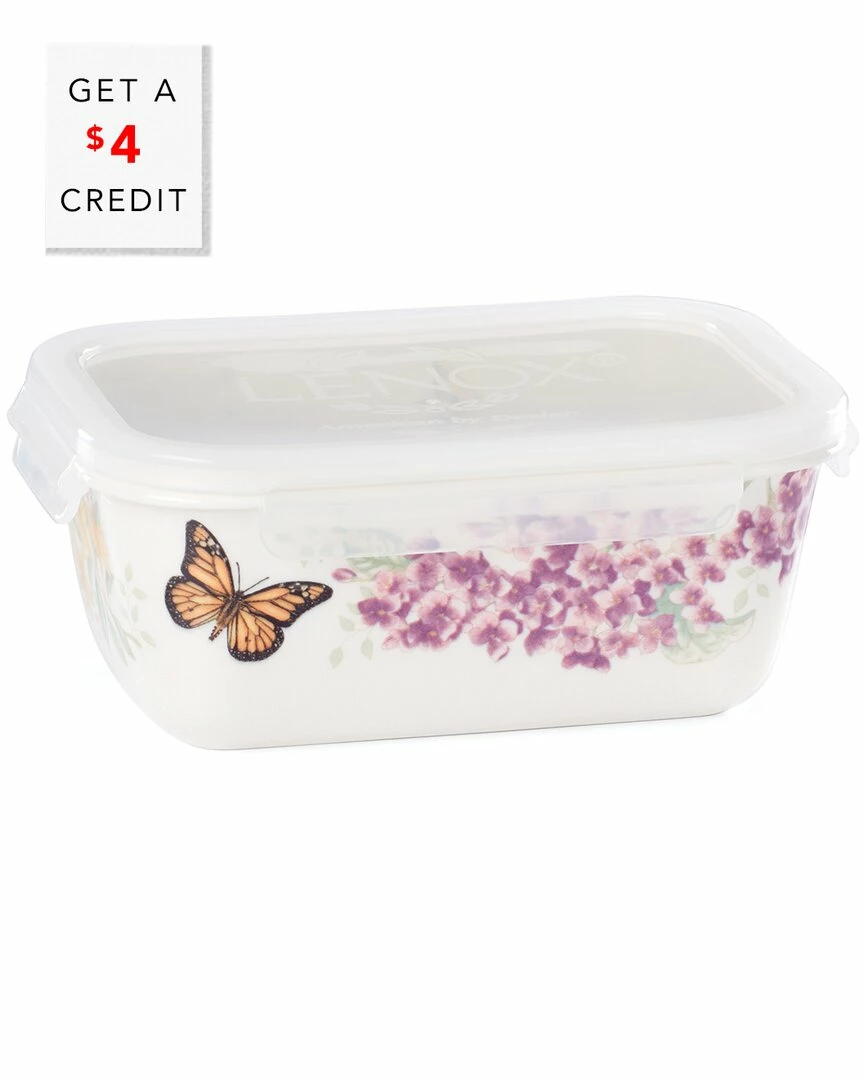 - Easily serve food, store leftovers or simply organize your pantry with this pretty food container from the best-selling Butterfly Meadow collection by Lenox. It’s crafted of durable porcelain and features a beautiful pattern of florals and insects. The quick-snap lid makes it easy to pop on and off and prevents against any spills or leaks. Plus, the entire thing is dishwasher and microwave safe]