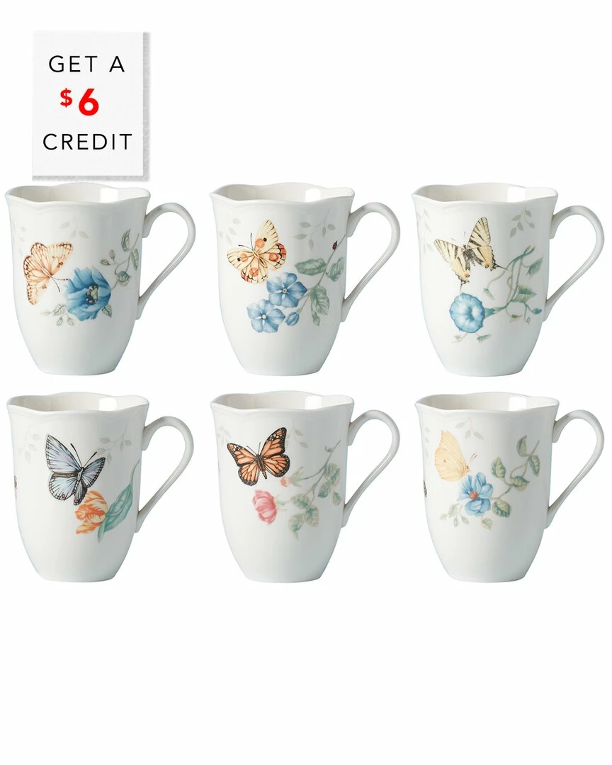 - This 6-piece mug set features the classic Butterfly Meadow pattern of fresh florals, buzzing insects and spring colors. Crafted in white porcelain with a gently scalloped rim, it’s a beautiful set for enjoying your morning coffee or tea.