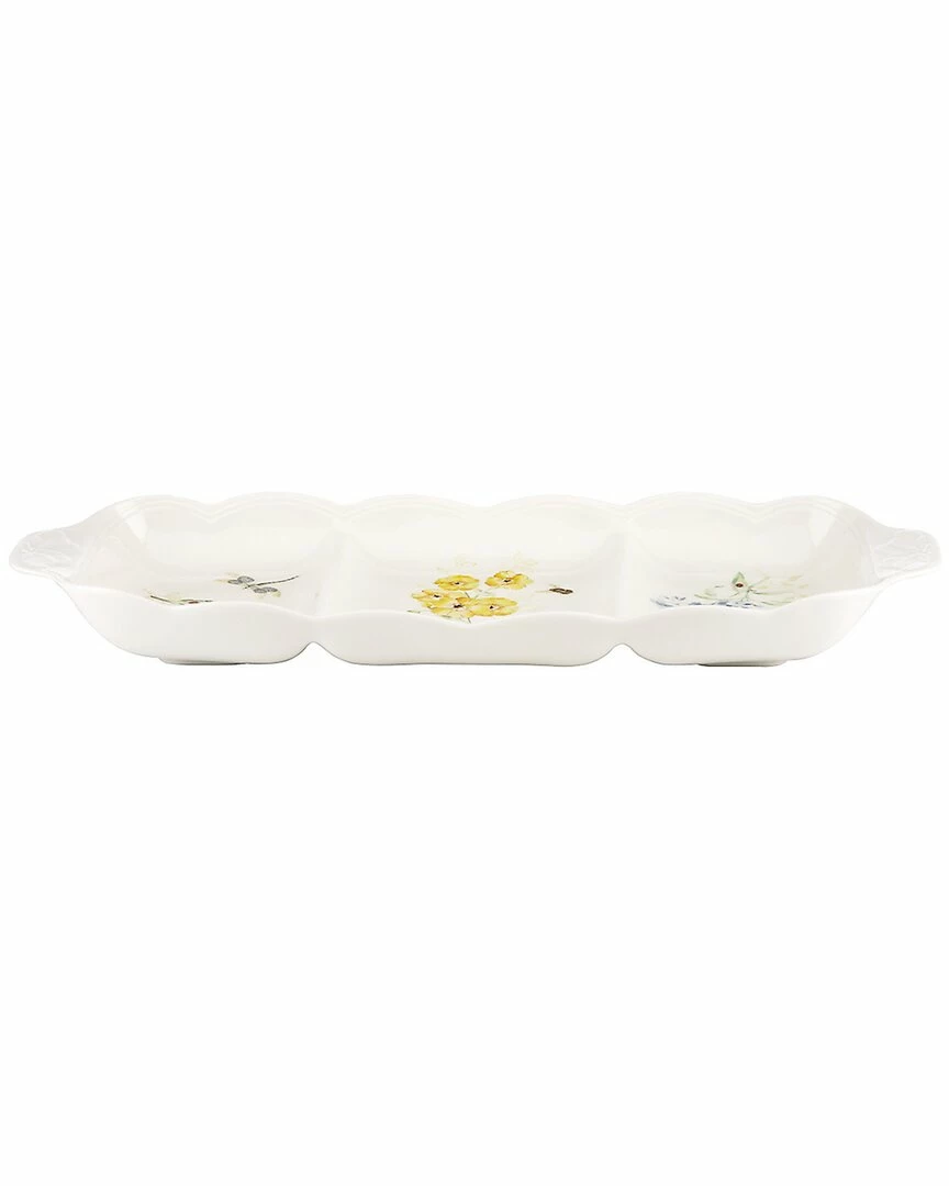 - Crafted from dishwasher and microwave-safe durable white ceramic porcelain, the Butterfly Meadow 16inDivided Serving Dish features a scalloped rim and dragonfly reliefs on either handle. A different garden design plays out within each of the serving dish’s three sections.