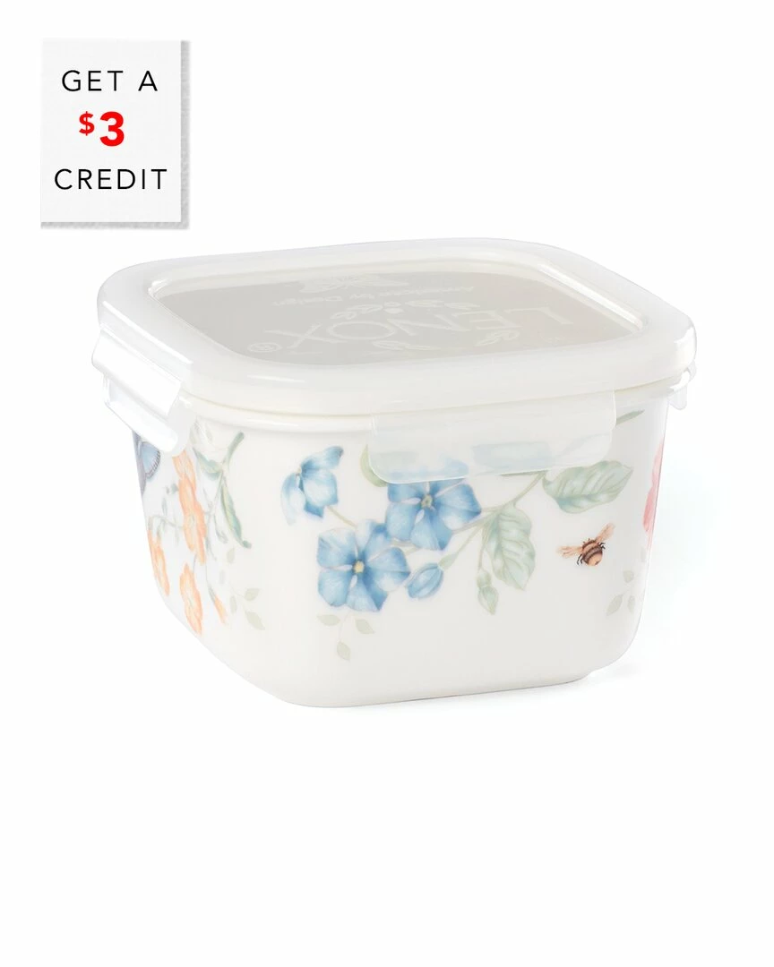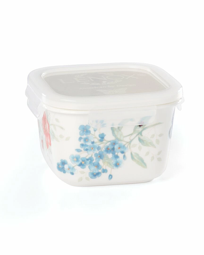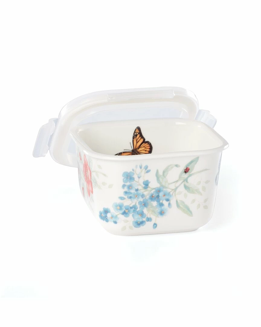 - Easily serve food, store leftovers or simply organize your pantry with this pretty food container from the best-selling Butterfly Meadow collection by Lenox. It’s crafted of durable porcelain and features a beautiful pattern of florals and insects. The quick-snap lid makes it easy to pop on and off and prevents against any spills or leaks. Plus, the entire thing is dishwasher and microwave safe]