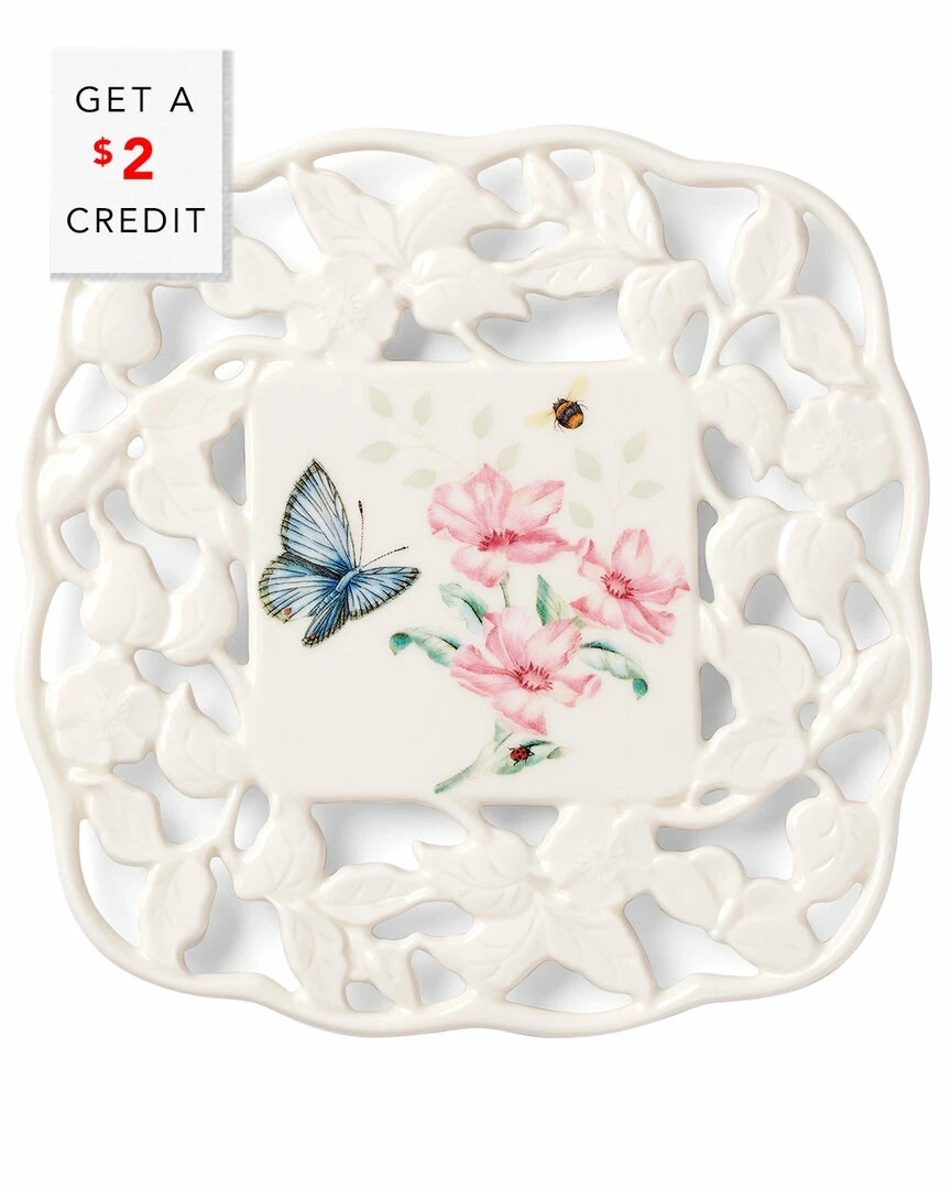 - Featuring the iconic, original pattern, the Butterfly Meadow trivet features unique, pierced details. Perfect for serving your favorite dishes while keeping your surfaces safe from heat, this piece is dishwasher-safe for added convenience.