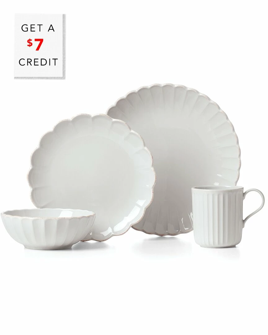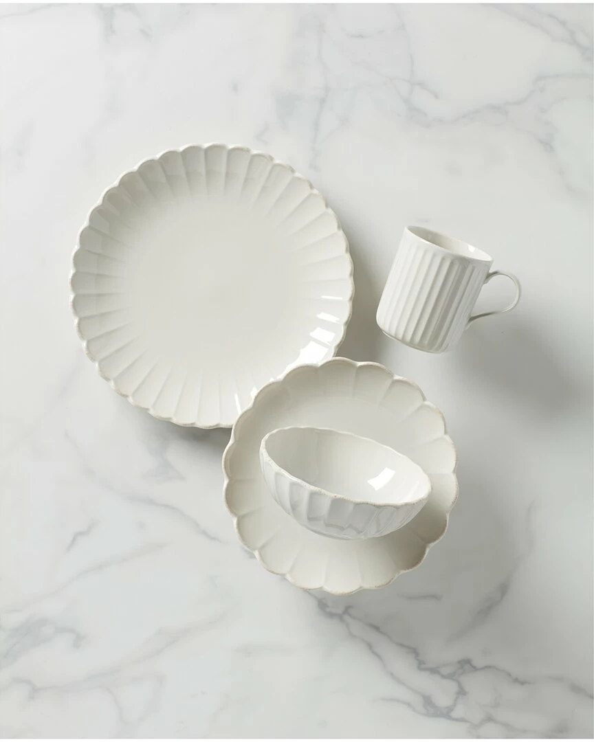 - Introducing a fresh and feminine new design to celebrate the 10 year anniversary of French Perle] This 4-piece place setting is a twist on the classic country look with its clean, elegant motif, beautiful ruffles and tea-stained finish. For distinct cafe charm, mix French Perle Scallop with any of the other coordinating collections, like Classic, Groove and Bead. Bon appetit]