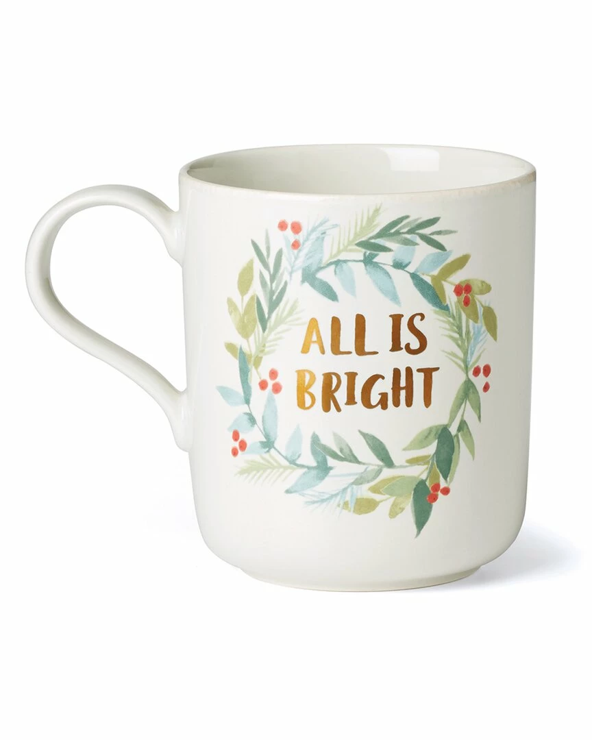 - Design details: a festive fresh spin on the French perle favorites. These mugs feature a wreath of artistic holiday holly with leaves, branches, and berries in a hand painted style around the words “all is calm”. Crafted with smooth scallops on a snowy white base for a creative winter feel.