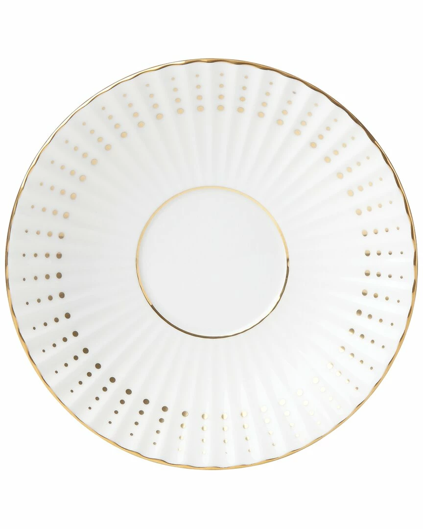 - The chic Golden Waterfall Saucer adds texture and shine to casual and formal tea settings. The fluted rim of the saucer features radiating gold dots and a shimmering 24-karat gold trim on durable white bone china. This item is dishwasher-safe, for added convenience.