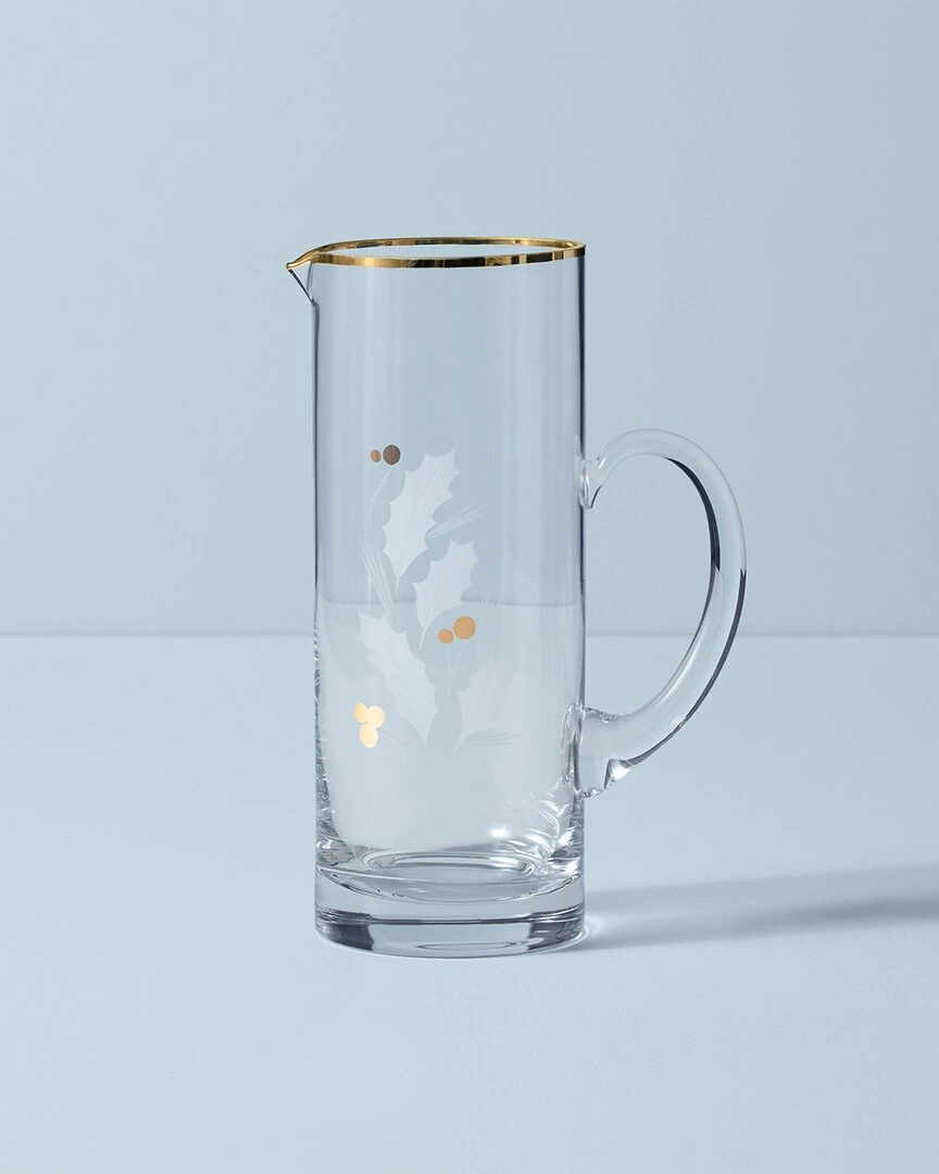 - Design details: etched holly leaves with golden berries form an elegant holiday pattern on this glass pitcher. A delicate gold finish creates a polished design around the rim.