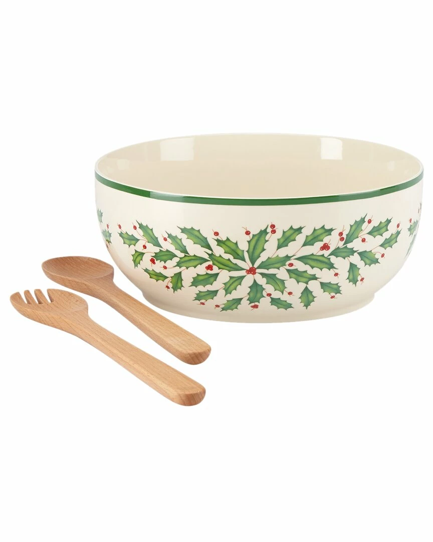 - Design details: this festive ceramic salad bowl features Lenox’s iconic holly and berries motif, and includes a rustic pair of wooden salad servers. This is a set with personality and charm.