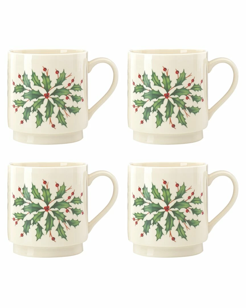 - Design details: these stackable ceramic mugs are easy to store and leave more room for an expanding collection of holiday dinnerware. These understated mugs feature a festive illustration of a holly plant.