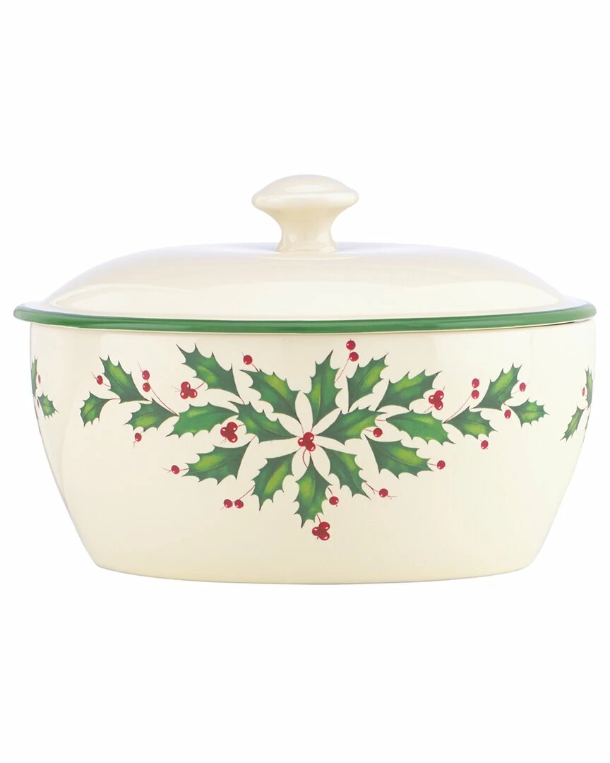 - Design details: the hosting the holidays casserole dish is ideal for serving large dinner parties. Crafted in ceramic, this spacious dish features a festive holly that comes with a matching lid.
