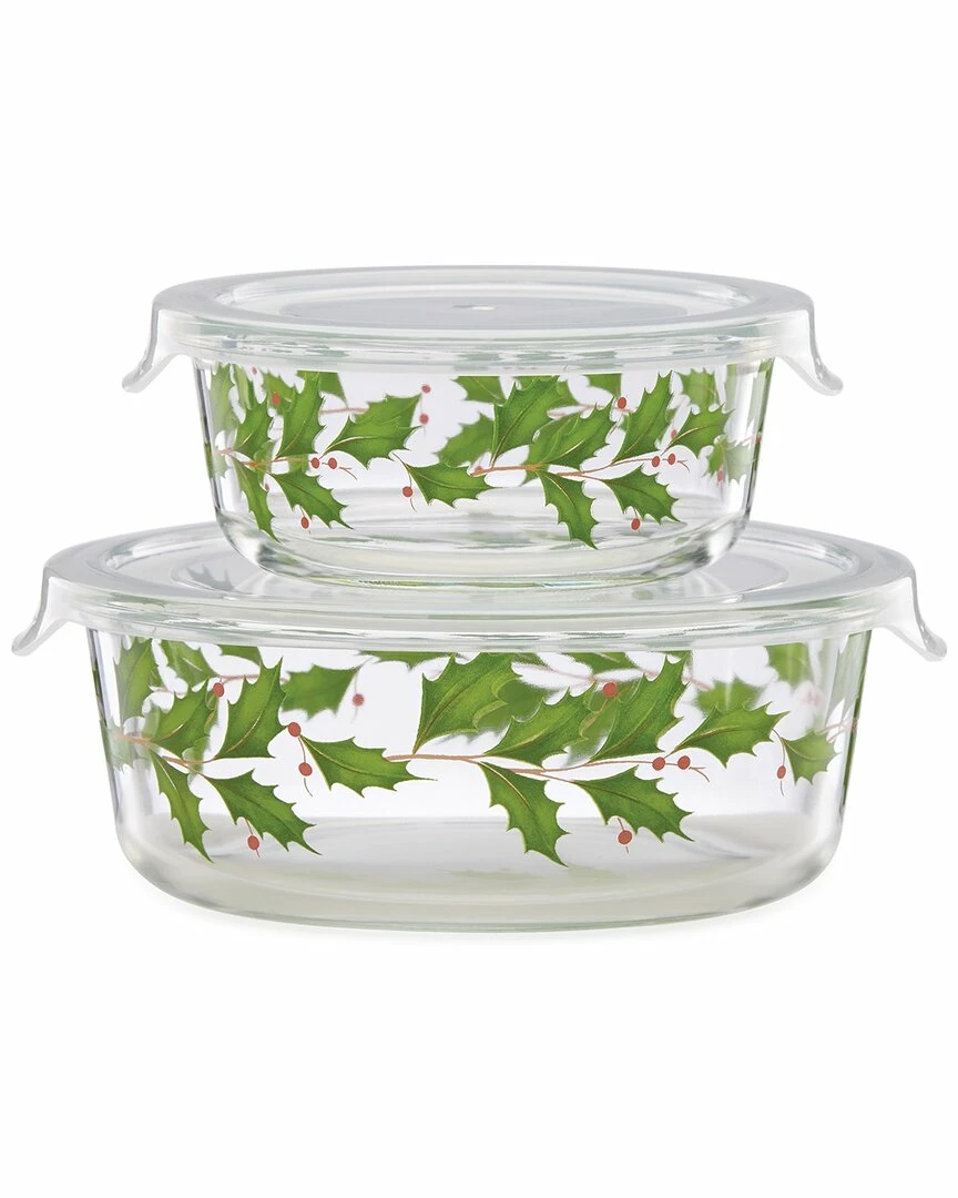 - Design details: send guests home with leftovers with this two-piece set of glass bowls in a charming holly leaf pattern.