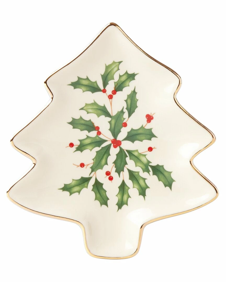 - Design details: this ivory ceramic tree-shaped plate features the iconic Lenox holly and berries motif along with 24-karat gold accents on the outside border of the piece for shimmer and shine.