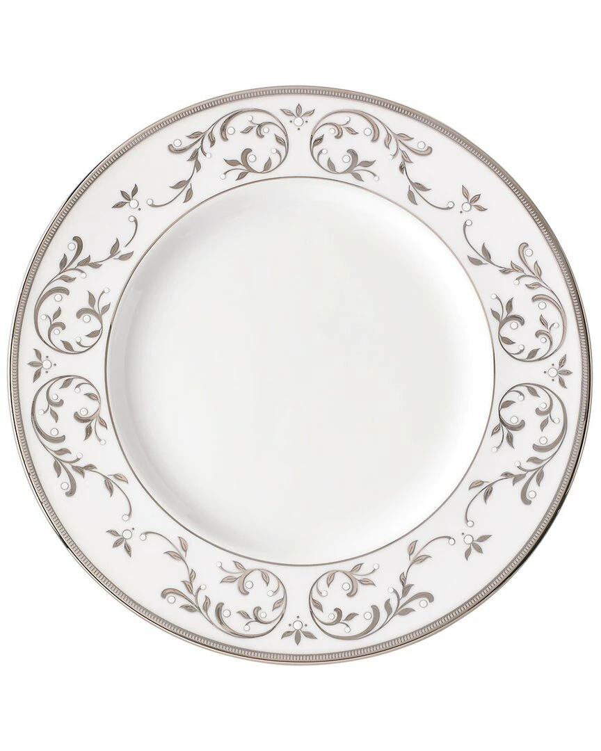 - The pristine and extravagant Opal Innocence Silver Platinum 9″ Accent Plate features a faultless white surface and a delicate silver motif of raised dots. This ornate and durable bone china accent plate is accented in precious platinum, and is dishwasher-safe for added convenience.