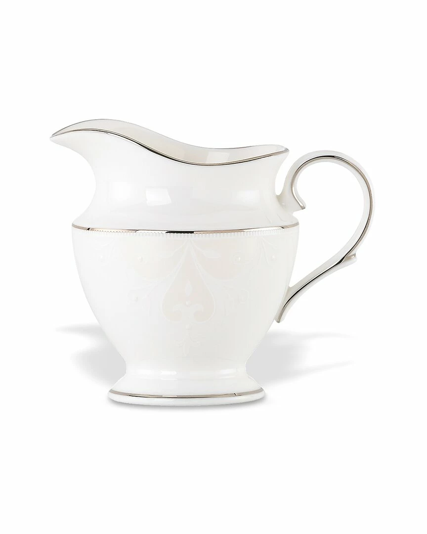 - The ornate and stylish Opal Innocence Scroll Creamer features a shimmering white mica scroll motif with hand-applied enamel dots. This elegant and durable bone china creamer is accented in precious platinum and is dishwasher-safe for added convenience.